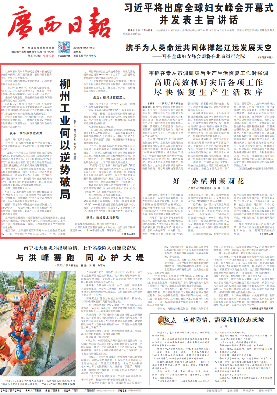 10月10日,《广西日报》头版头条刊发文章《柳州工业何以逆势破局》,全文如下: