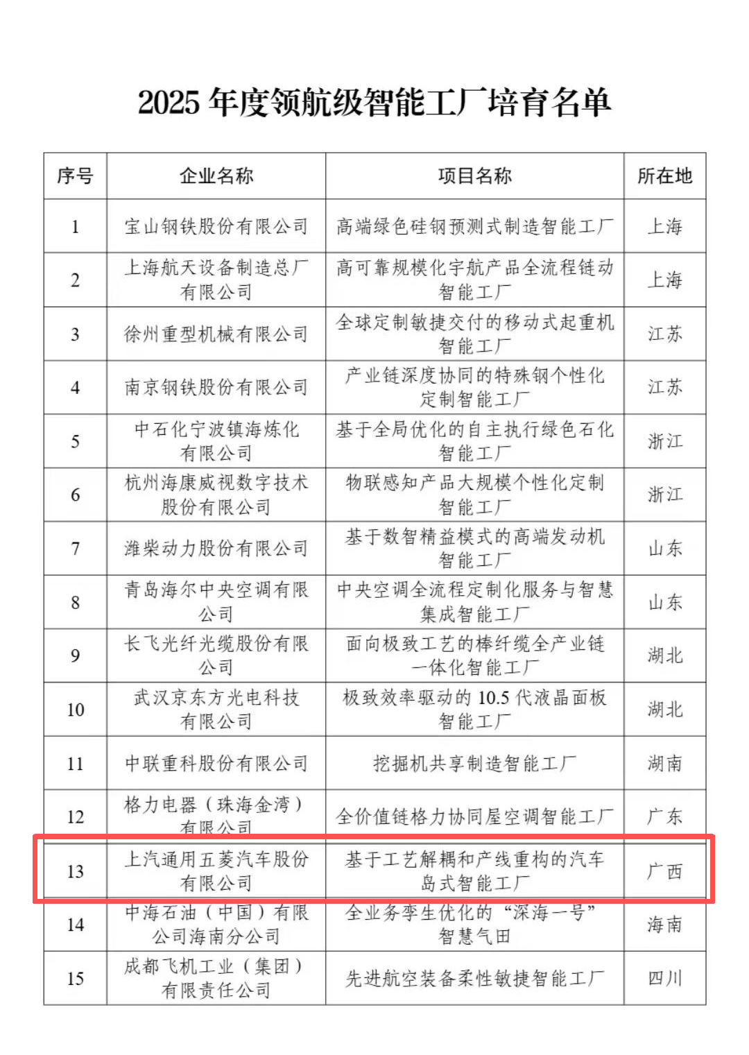 近日,工业和信息化部公布全国首批15家领航级智能工厂项目培育名单。上汽通用五菱汽车股份有限公司以“基于工艺解耦和产线重构的汽车岛式智能工厂”成功入选,是中国汽车行业唯一入选该名单的企业。