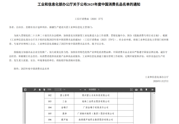 近日,工业和信息化部公布“2025年度中国消费名品”名单,广西金嗓子集团旗下“金嗓子”荣耀入选。这是继柳州螺蛳粉之后,柳州再添一张国家级消费名品名片。