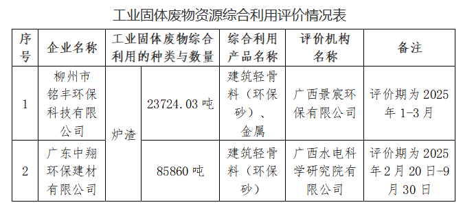 根据《自治区工业和信息化厅关于做好工业固体废物资源综合利用评价工作的通知》(桂工信节能〔2019〕67号)有关规定,柳州市铭丰环保科技有限公司、广东中翔环保建材有限公司委托第三方机构开展了2025年固体废物资源综合利用评价,出具了评价报告,并分别报鹿寨县科技工贸和信息化局及融安县科技工贸和信息化局备案,现将评价情况予以公布如下: