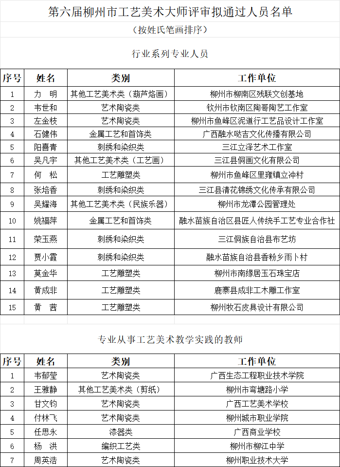 第六届柳州市工艺美术大师拟通过人员名单公示